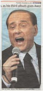 Giovedì 3 Novembre, sulla DRL che da Woolwich porta al City Airport di Londra sfoglio Metro, il quotidiano popolare che moltissimi londinesi leggono, vedo lui… e si ride ancora. Una storia infinita di sberleffi. Qui si compatisce ironicamente il nostro amato leader che è triste, non certo per aver portato l’Italia sull’orlo del baratro, ma perchè le condizioni attuali di crisi internazionale, che pure lui smentisce almeno per la florida Italia, gli impediscono di lanciare sul mercato il suo nuovo CD autobiografico, pieno di amore, cuore, femmine e strapotere della sua virilità….
