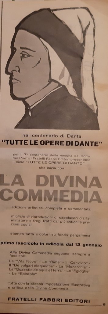 1965. La casa editrice Fabbri festeggia I 700 anni dalla nascita di Dante Alighieri con la pubblicazione a fascicoli delle sue opere.