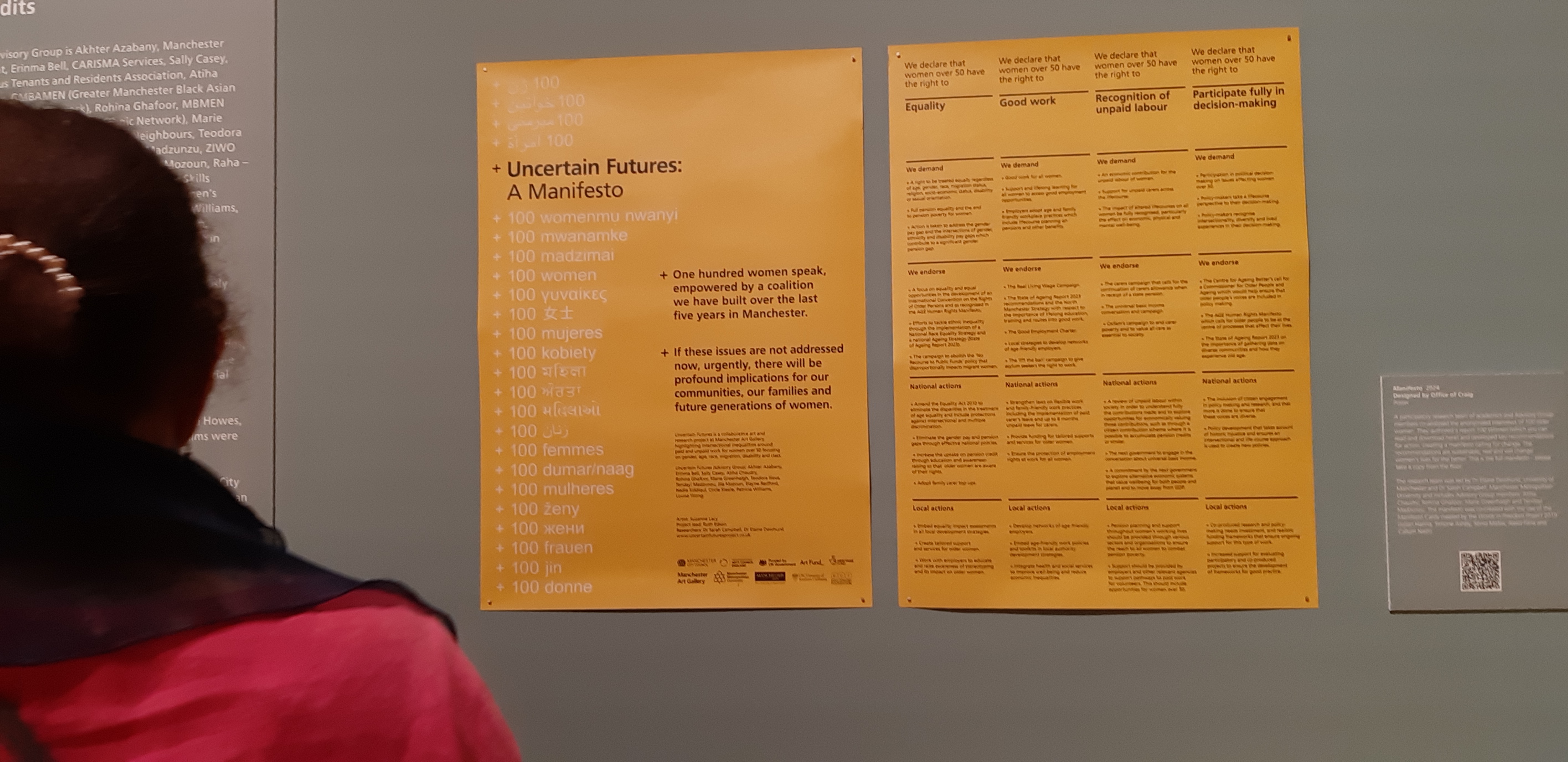 Lungo il tragitto, appare inaspettato uno spazio senza quadri, scopriamo subito che è dedicato al progetto Uncertain Futures (Futuri Incerti), che vede protagoniste le ultracinquantenni di Manchester. Che titolo accattivante! Ci fermiamo per capire meglio. È uno spazio sorprendente. Il Manifesto del progetto occupa una parete, ma viene offerto al pubblico anche in forma cartacea: sfondo giallo sole, con caratteri neri che sembrano saltare dal foglio e posarsi velocemente sugli occhi di chi lo legge. Più avanti, su un’altra parete, campeggiano due gigantografie delle 100 donne che hanno partecipato al progetto. Chiude il percorso uno spazio dedicato alla proiezione di un filmato con interviste e racconti di alcune donne protagoniste della ricerca.