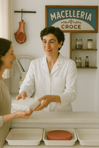 Alta, magra, capelli neri e viso sincero, la signora Tonia lavora nella macelleria di famiglia. Ogni giorno è lì, dietro il bancone con il suo camice bianco immacolato, pronta a servire i clienti. Suo marito Checco è un uomo accogliente, dallo sguardo sorridente. I signori Croce vivono con i loro due figli in un appartamentino accanto al negozio, ma al momento del grande boom degli anni ‘60 si trasferiscono in uno più grande, in una delle vie che corrono parallele al corso cittadino.