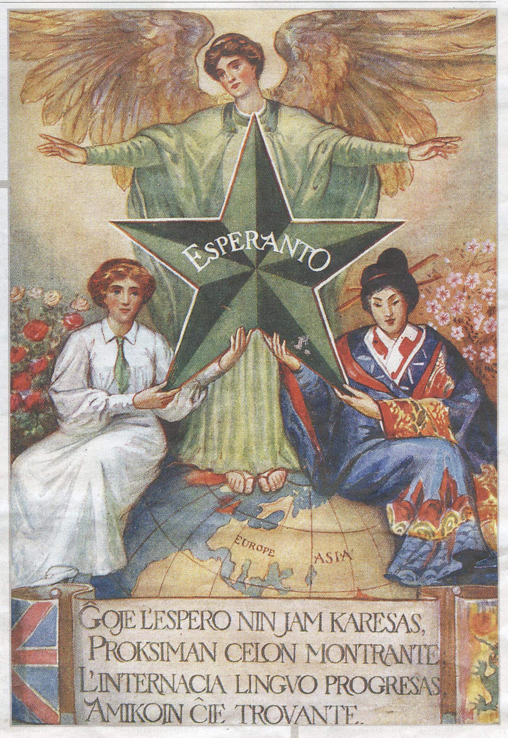 Bellissima la cartolina di propaganda dell’ Esperanto,“idioma di pace” e progetto diplomatico di comunicazione. Arricchisce con il suo simbolismo immaginifico l’articolo di Bruno Ventavoli,